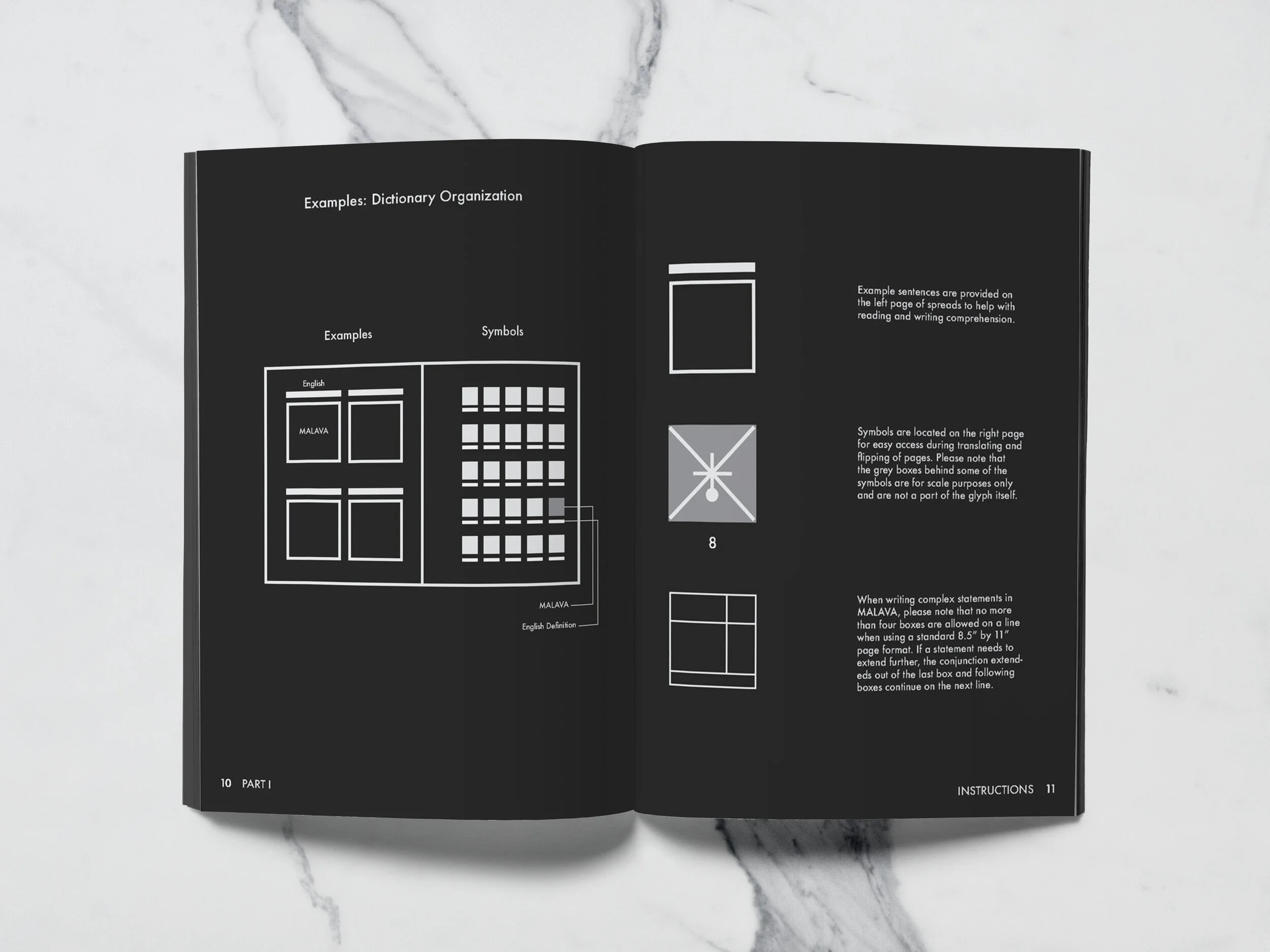 As a part of a class assignment to create a new dictionary, my group and I set out to create a language that was both visually pleasing, and maintained a set of rules that allowed for continuous expansion. The result is Malava, a language that was built to be contained in a series of grids, and revolved around the idea of syntax and tone in order to express thought. Malava’s print structure is created with people new to the language in mind. On the left page of the Malava dictionary, there are examples of how to use the language, from simple statements to complex sentences, whereas the right pages contain all of the vocabulary words, allowing users to easily navigate through the language of Malava.