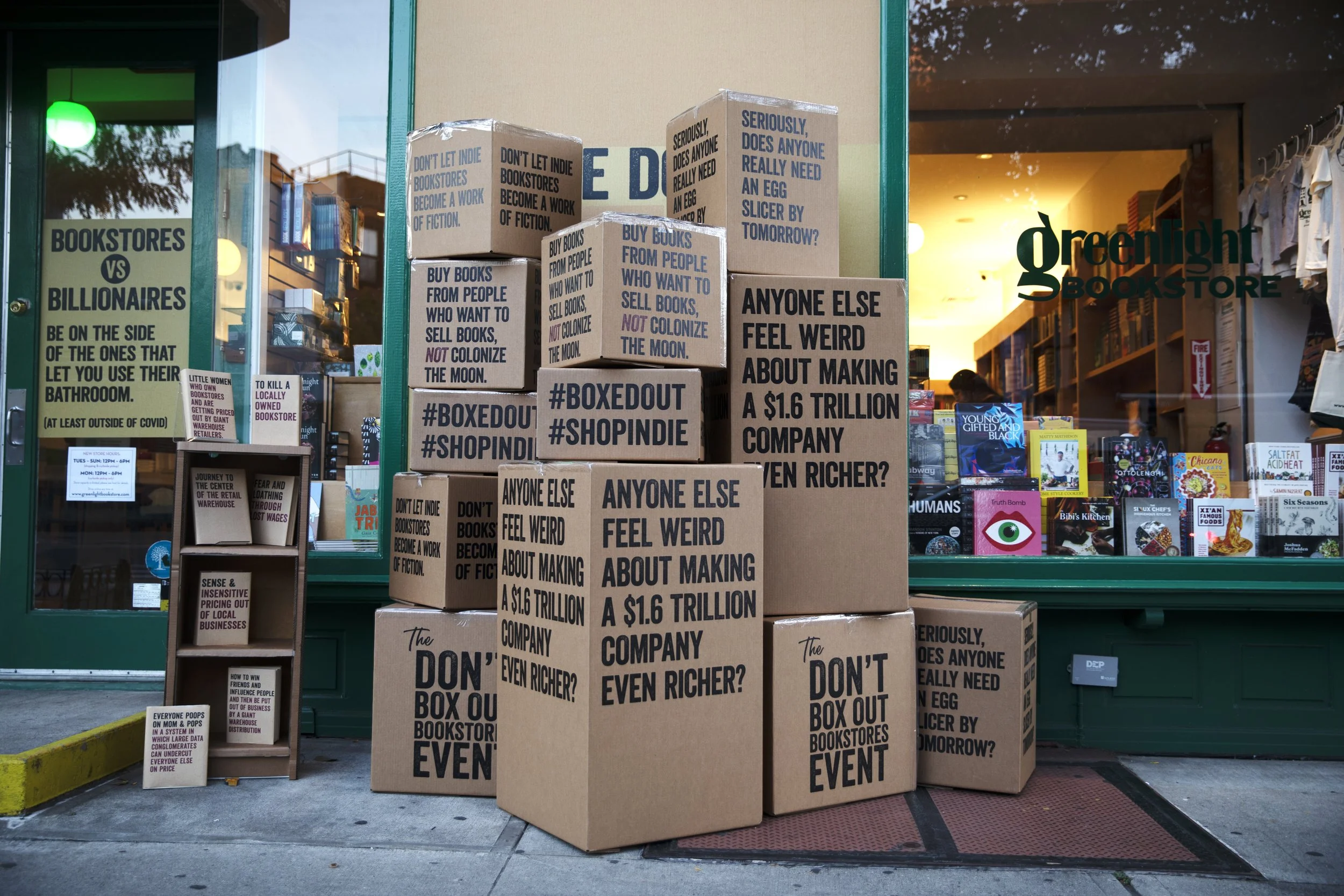 For the American Booksellers Association, we took on Amazon and Prime Day by covering independent bookstore front windows, awnings, displays, and sidewalks with what looked like Amazon boxes. The boxes were printed with anti-Amazon headlines, and to create scale on a limited budget, we chose six stores in key media locations - NYC, DC, LA - for the full immersive experience, and shipped posters and DIY kits to hundreds of other stores to participate in a coordinated activation nationwide.